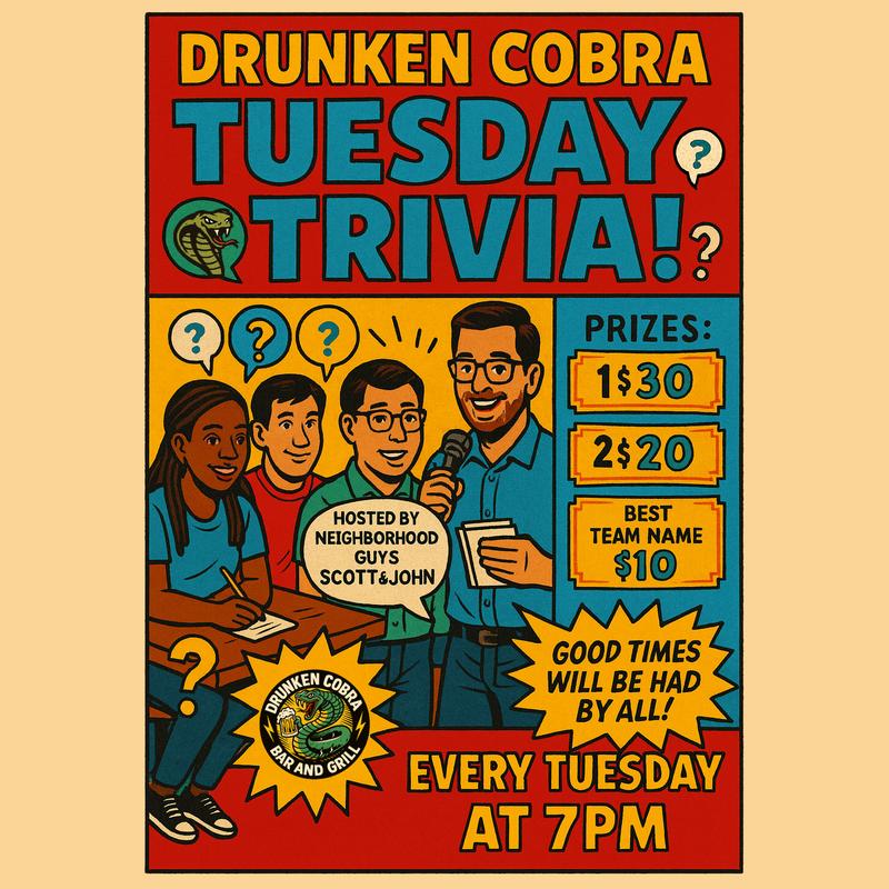 Enjoy delicious savory east and flex your brains with Trivia provided by neighborhood Gents!